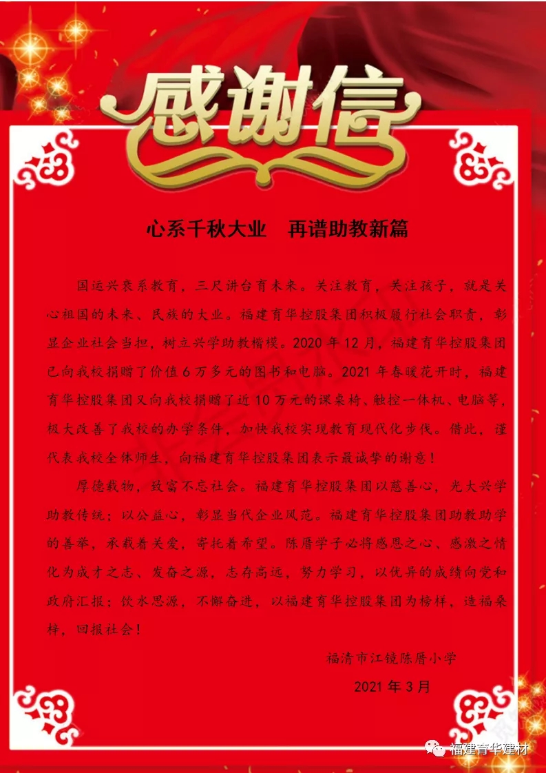 2020年12月31日,福建育華控股集團(tuán)向陳厝小學(xué)捐贈(zèng)各類物資,建立學(xué)校圖書室與電腦室。捐贈(zèng)儀式后集團(tuán)總裁陳育科在參觀學(xué)校過程中,聽到師生們反映教學(xué)設(shè)備老舊,辦學(xué)條件與現(xiàn)代化教學(xué)要求還有較大差距,目前學(xué)校還急需課桌椅、觸控一體機(jī)、電腦、圖書柜等物資時(shí),陳總現(xiàn)場(chǎng)當(dāng)即決定繼續(xù)捐贈(zèng),以徹底改善與提高陳厝小學(xué)的教學(xué)辦學(xué)條件,加快實(shí)現(xiàn)教育現(xiàn)代化步伐,并要求隨從人員抓緊對(duì)接辦理相關(guān)配套物資,盡快到位。