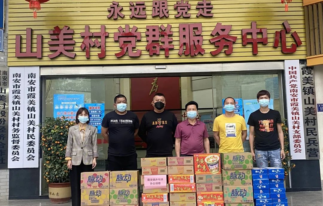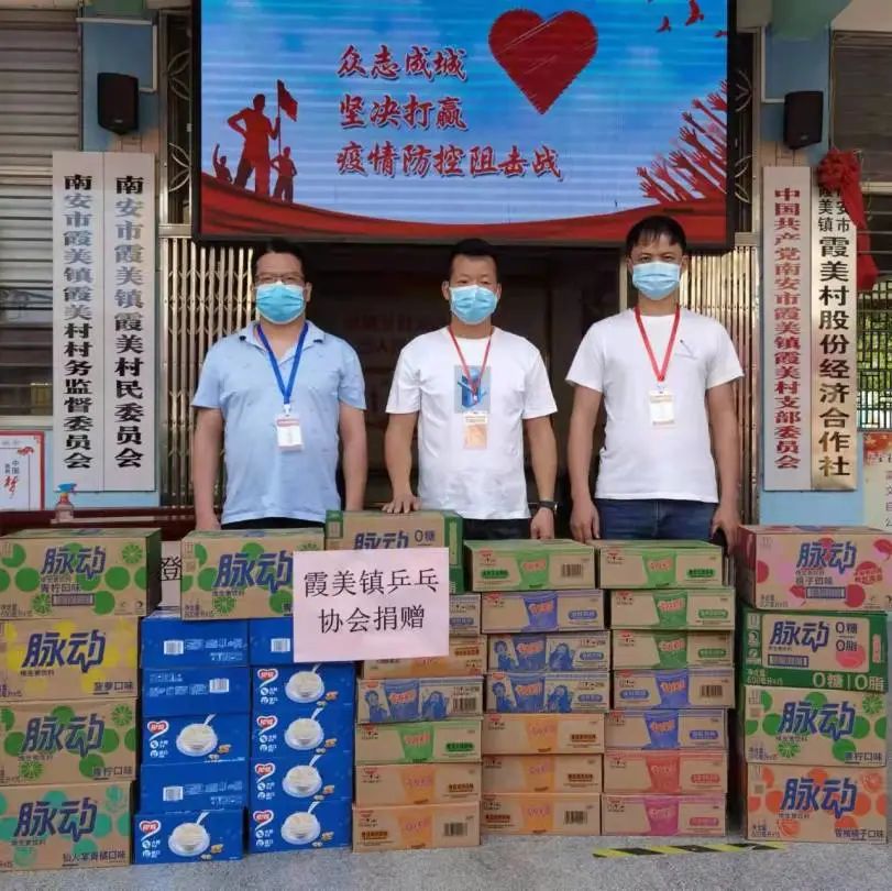 5、霞美鎮(zhèn)乒乓球協(xié)會分別向霞美村、山美村、邱鐘村捐贈泡面20箱、花生牛奶10箱、脈動飲料10箱,助力村級疫情防控工作。