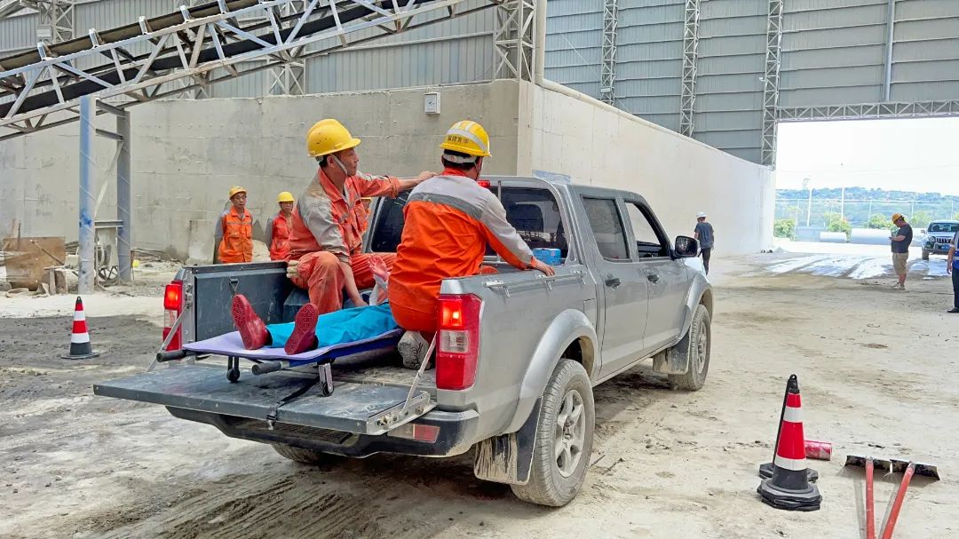 早上8時,演練正式開始?,F(xiàn)場安全員電話報告,在車間檢修設備的過程中,某某作業(yè)人員檢修調整電機時突然啟動導致右手被皮帶輪扎傷,右小臂受到機械傷害,導致骨折,情況十分危急,請求項目救援。接到事故報告后,一比疆項目應急小組立即啟動事故救援應急預案,并按照程序逐級報告,項目應急救援隊伍迅速集結,在現(xiàn)場指揮調度,有序開展救援工作,現(xiàn)場將所有作業(yè)人員和設備撤出到安全區(qū)域,對事故現(xiàn)場進行封鎖警戒,嚴防次生災害發(fā)生,救援人員使用擔架等救援工具迅速將傷員轉移到安全區(qū)域,醫(yī)療救護組立即對傷員進行應急綁扎,及時送往醫(yī)院救治。