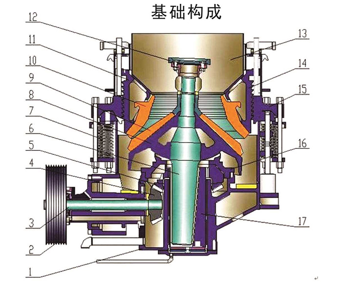 1.機(jī)架 2.大帶輪 3.傳動軸 4.小錐齒輪 5.大錐齒輪 6.主軸 7.彈簧結(jié)構(gòu) 8.軀體 9.破碎壁 10.軋臼壁 11.調(diào)整套 12.分料盤 13.進(jìn)料斗 14.調(diào)整環(huán) 15.支撐套 16.碗型軸架部 17.偏心套